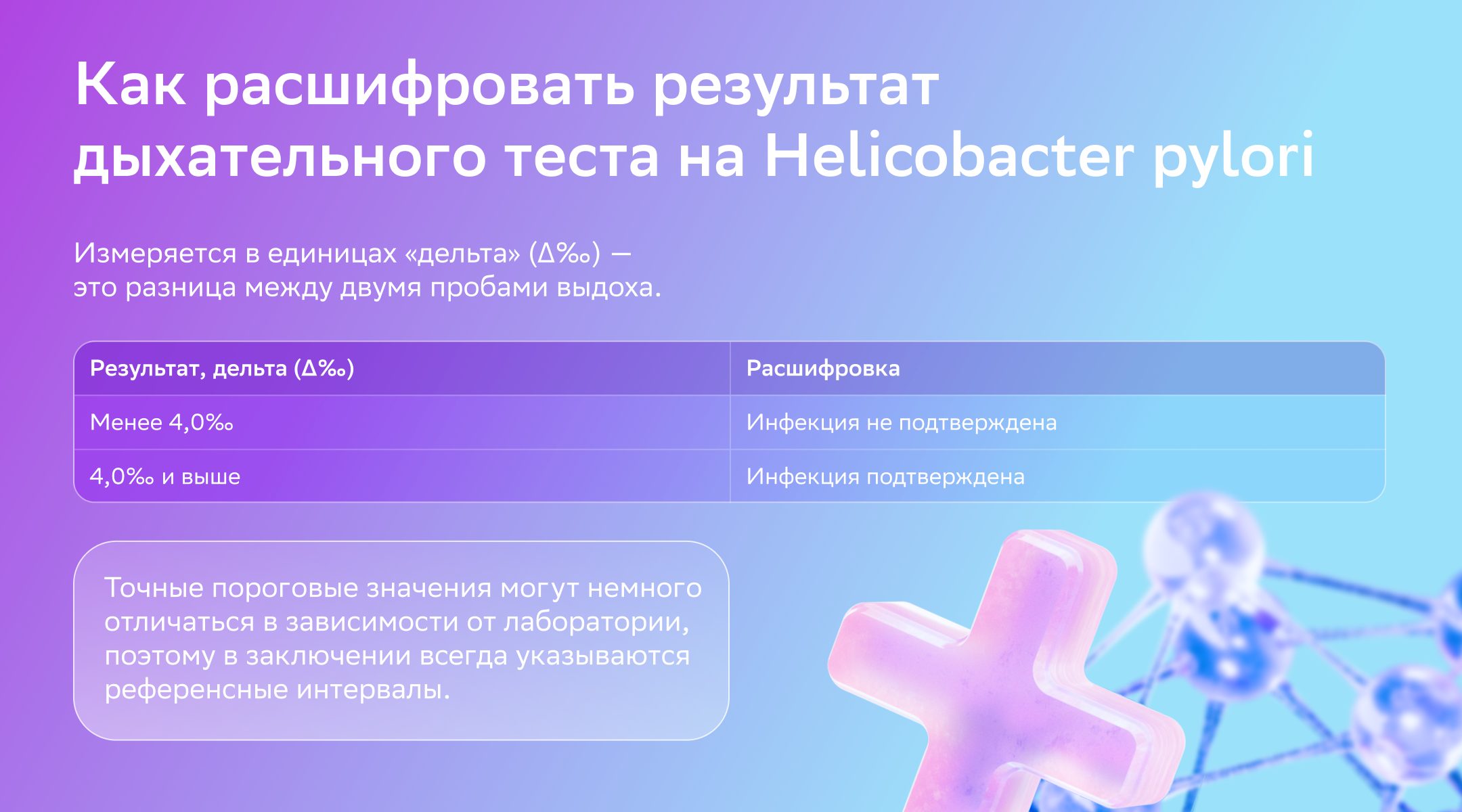 Результат выражается в единицах «дельта» (Δ‰) — это разница между двумя пробами выдоха.