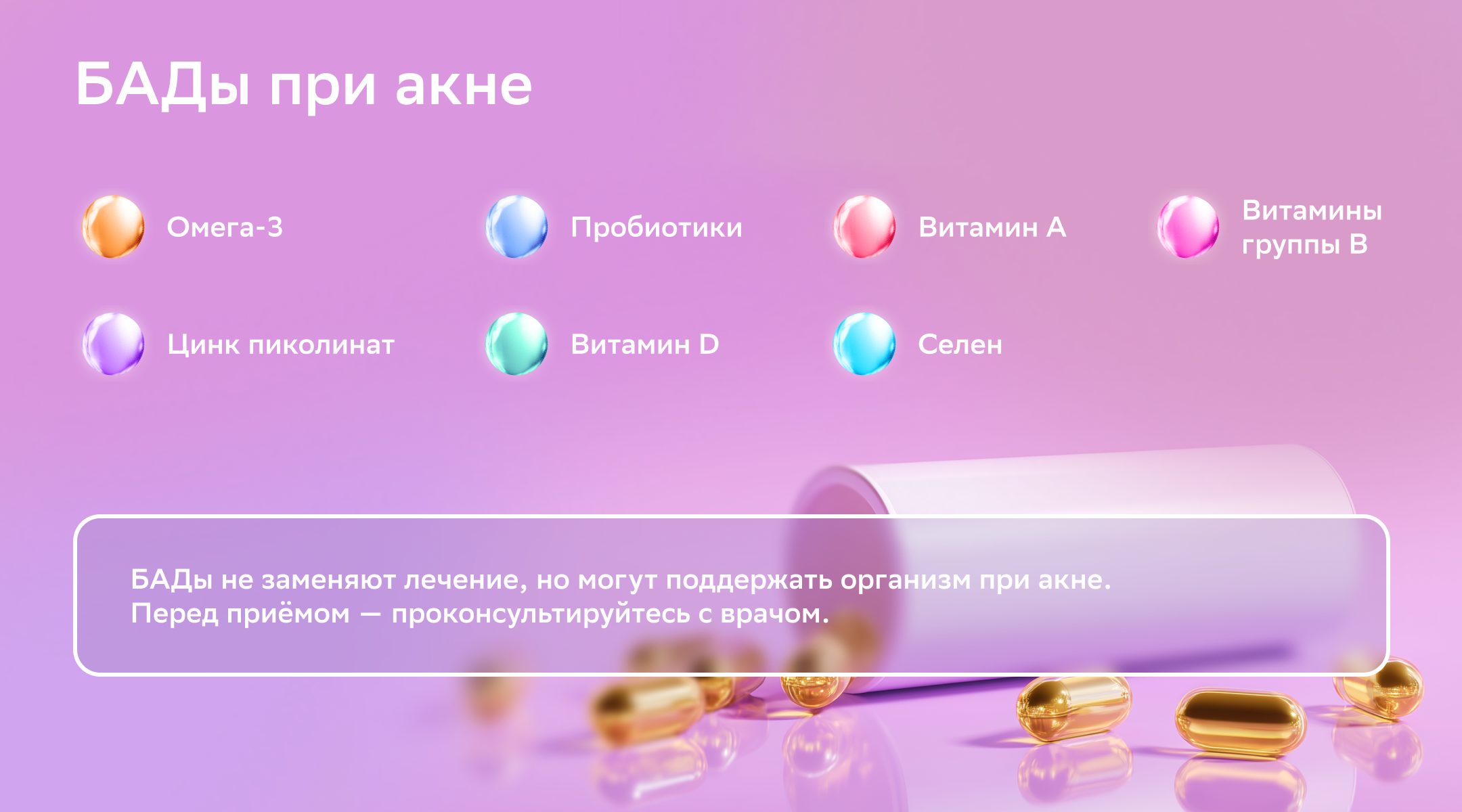 БАДы не заменяют лечение, но могут поддержать организм при акне. Перед приёмом — проконсультируйтесь с врачом.