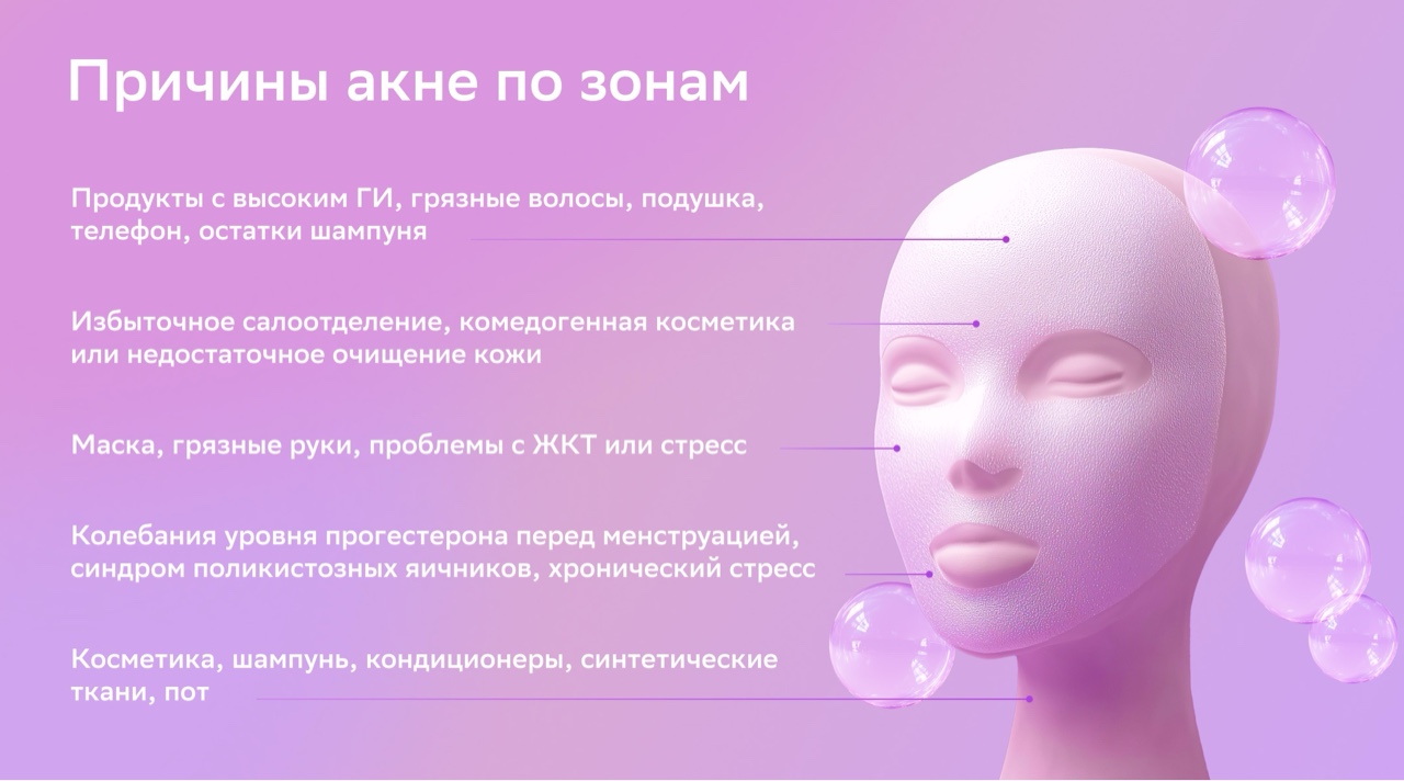 Многие замечают, что акне часто появляются в одних и тех же местах — на лбу, подбородке или щеках. Локализация высыпаний может указывать на определённые триггеры. Но такие разделения условны и не всегда точно свидетельствуют о причинно-следственной связи. Поэтому дерматологи редко опираются на эти данные при диагностике.