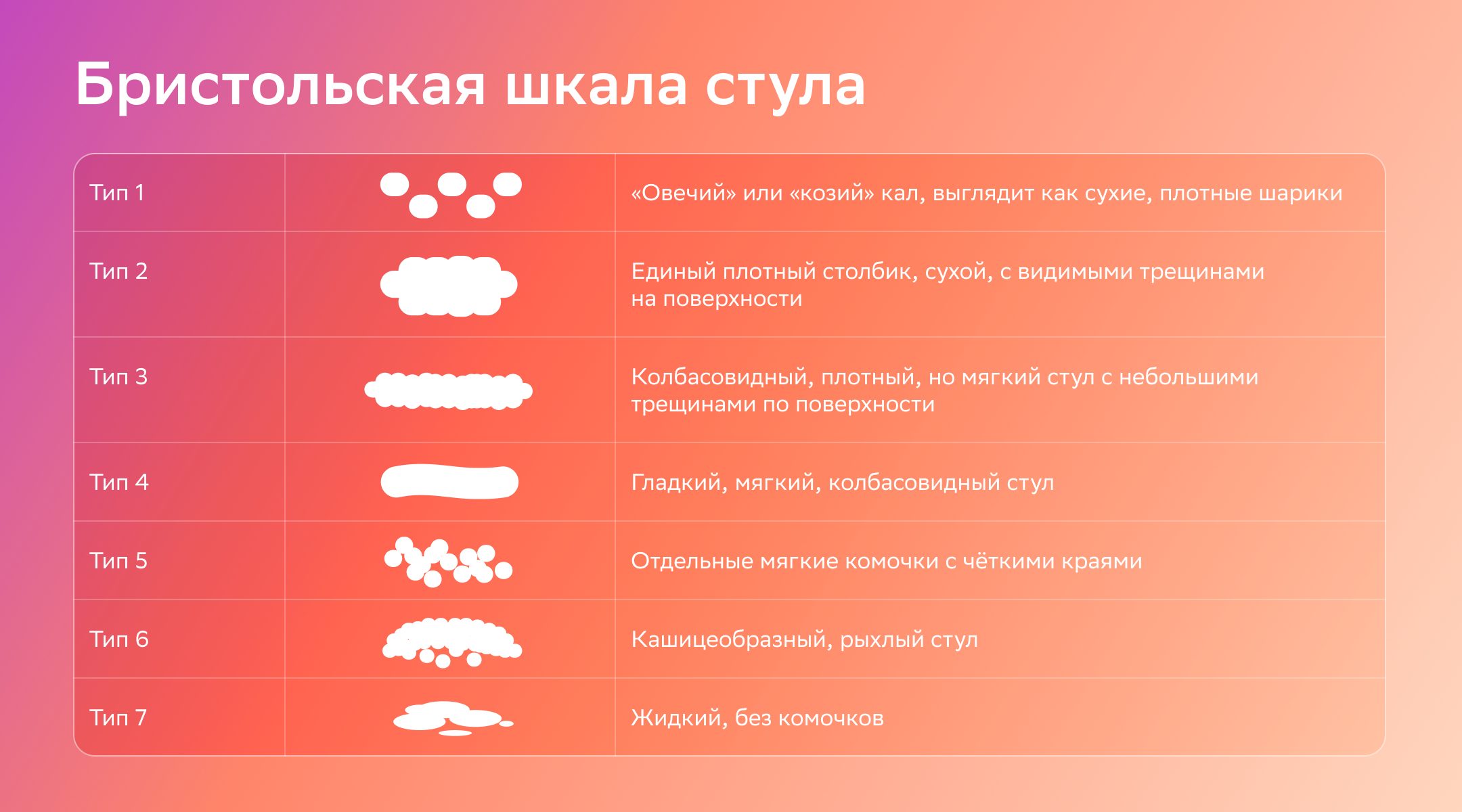 У детей: Стул может быть жидким и частым — это норма при грудном вскармливании. Но если у ребёнка старше 2 лет постоянно наблюдается тип 1 или 7 — это повод для обследования.