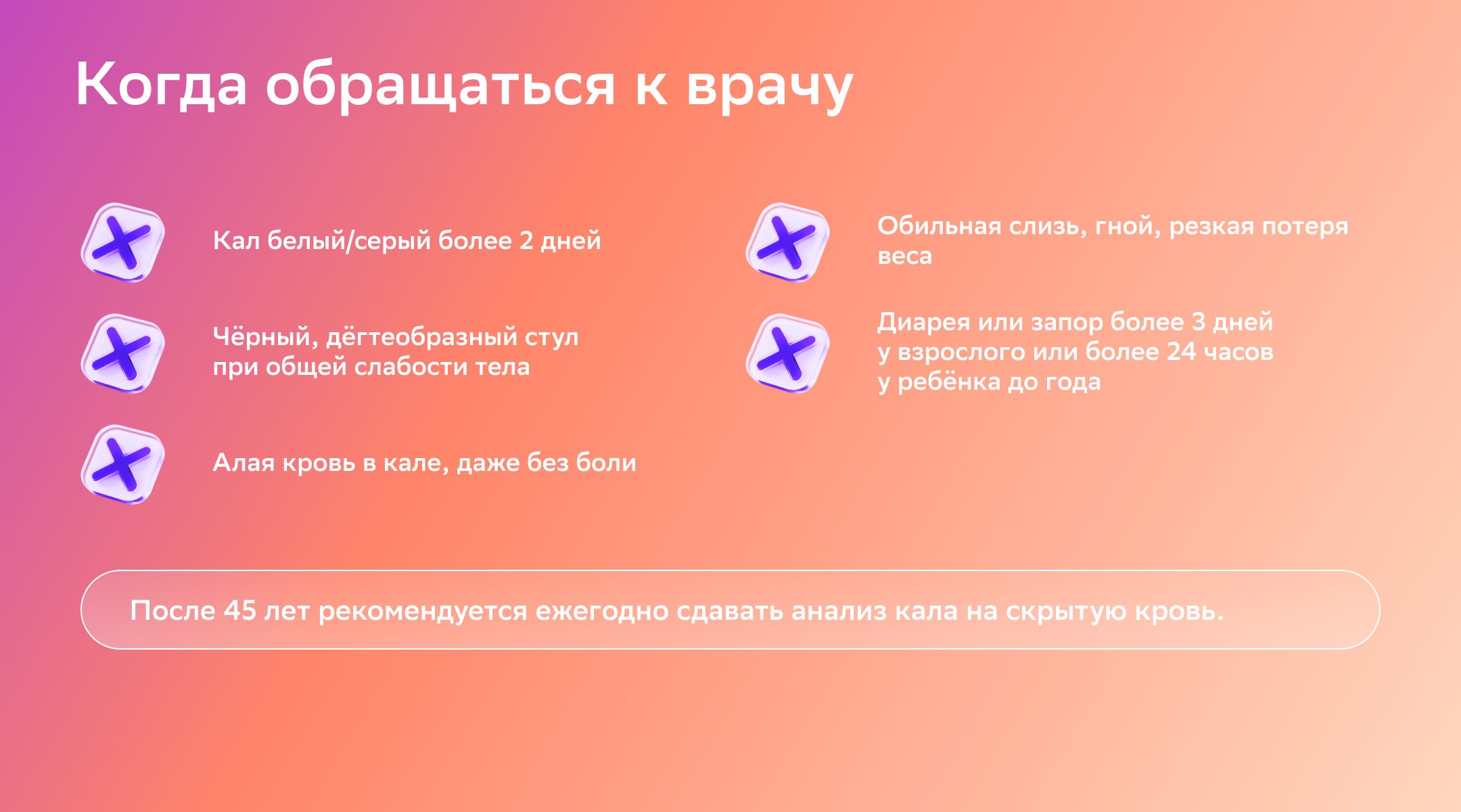 В таких случаях рекомендуется проконсультироваться с врачом — особенно если изменения сопровождаются болью, кровью, потерей веса или утомляемостью.
